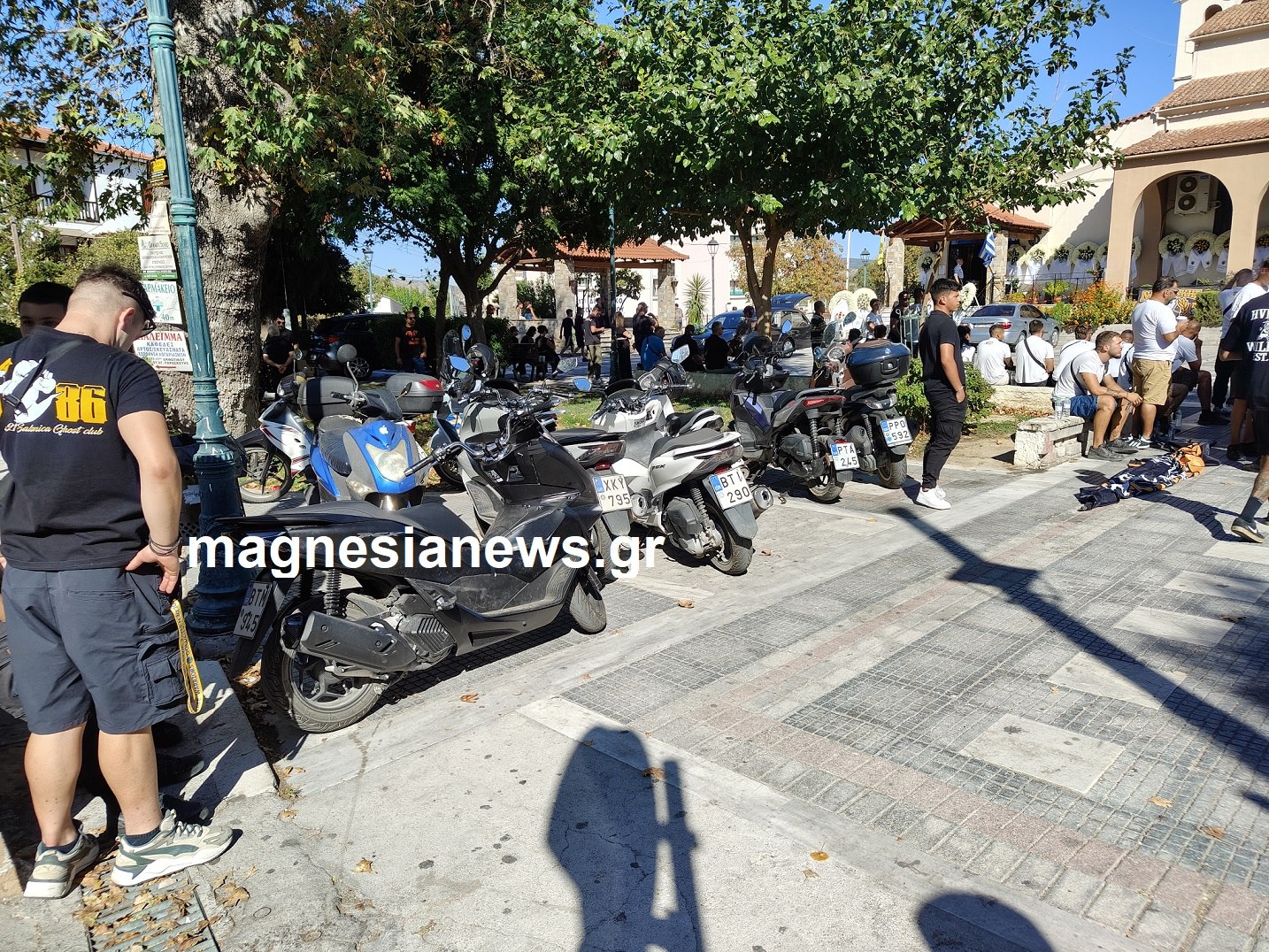 Οι φίλοι του τον «αποχαιρέτησαν» στον ιερό Ναό της Αγίας Παρασκευής με τα μηχανάκια τους σε παράταξη, έχοντας στήσει τα αγαπημένα του σύμβολα του Ολυμπιακού Βόλου και της ΑΕΚ. Ο ύμνος μάλιστα της ΑΕΚ ακουγόταν έξω από την εκκλησία και το φέρετρο του 18χρονου ήταν σκεπασμένο με την σημαία της.