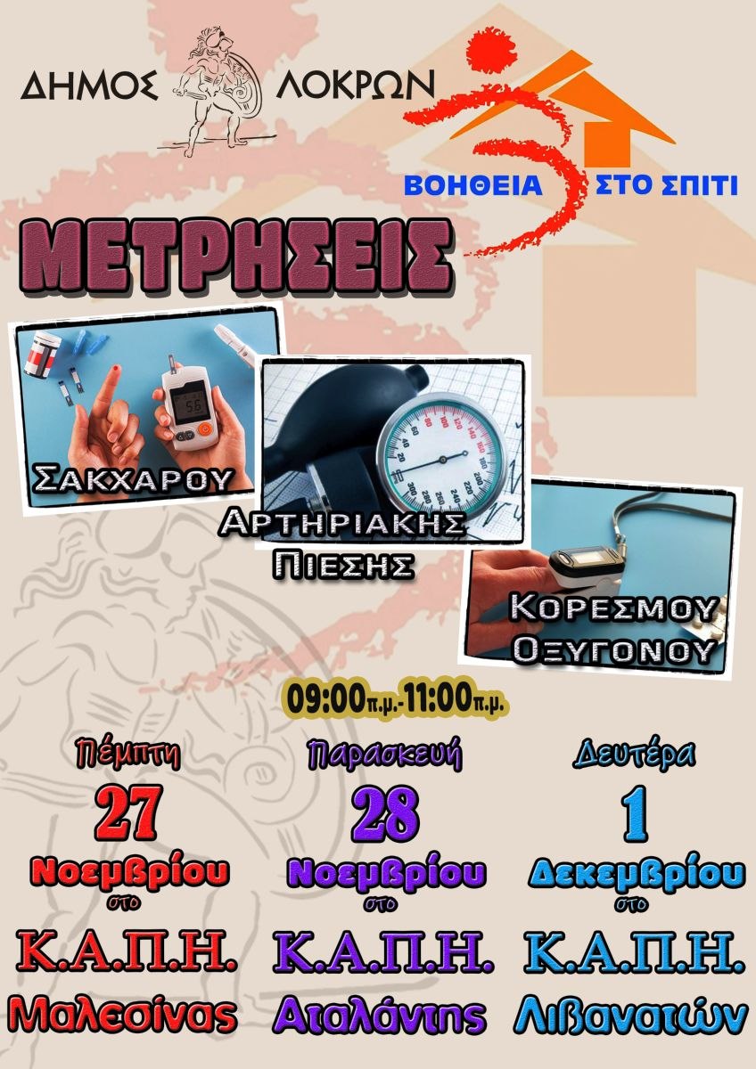 Ο Δήμος Λοκρών θα πραγματοποιήσει τριήμερη δράση για μετρήσεις σακχάρου, αρτηριακής πίεσης και κορεσμού οξυγόνου, στα ΚΑΠΗ.