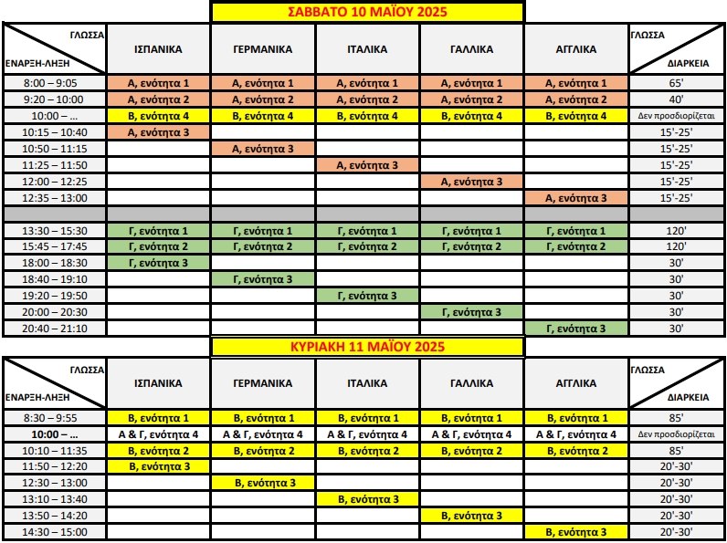 Οι Εξετάσεις θα διεξαχθούν το Σάββατο 10 Μαΐου 2025 και την Κυριακή 11 Μαΐου 2025 για την πιστοποίηση της γνώσης των γλωσσών Αγγλικής, Γαλλικής, Γερμανικής, Ιταλικής και Ισπανικής για τα επίπεδα: