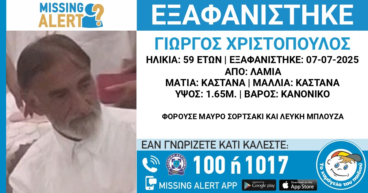 Missing alert για τον 59χρονο που εξαφανίστηκε από τη Λαμία
