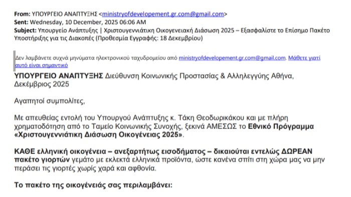 Ακόμη ένα παραπλανητικό e-mail εντοπίστηκε να διακινείται τις τελευταίες μέρες, αυτή τη φορά έχοντας τη μορφή δήθεν κρατικού προγράμματος που υπόσχεται δωρεάν γιορτινό πακέτο από το Υπουργείο Ανάπτυξης με τον τίτλο «Χριστουγεννιάτικη Διάσωση Οικογένειας 2025».