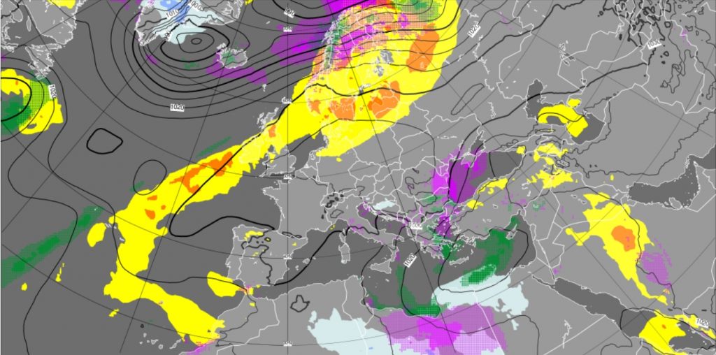 Σε αυτόν βλέπουμε με ροζ χρώμα τη «διαταραχή» που εισβάλλει από τη Βόρεια Ευρώπη και μέσω του Αιγαίου θα επηρεάσει τις περιοχές που αναφέρουμε πιο πάνω (με πράσινο χρώμα η εκδήλωση βροχών).
