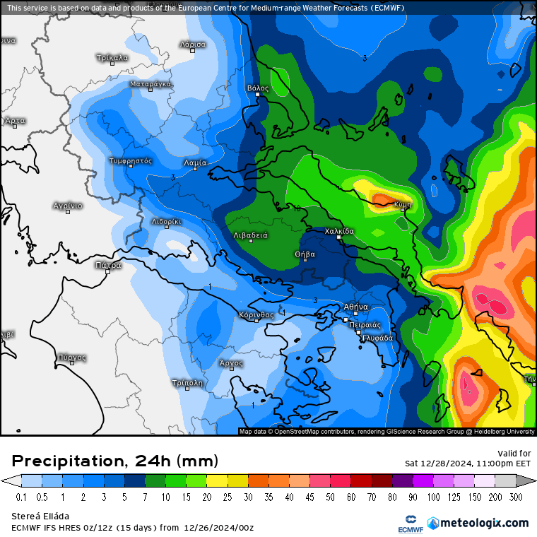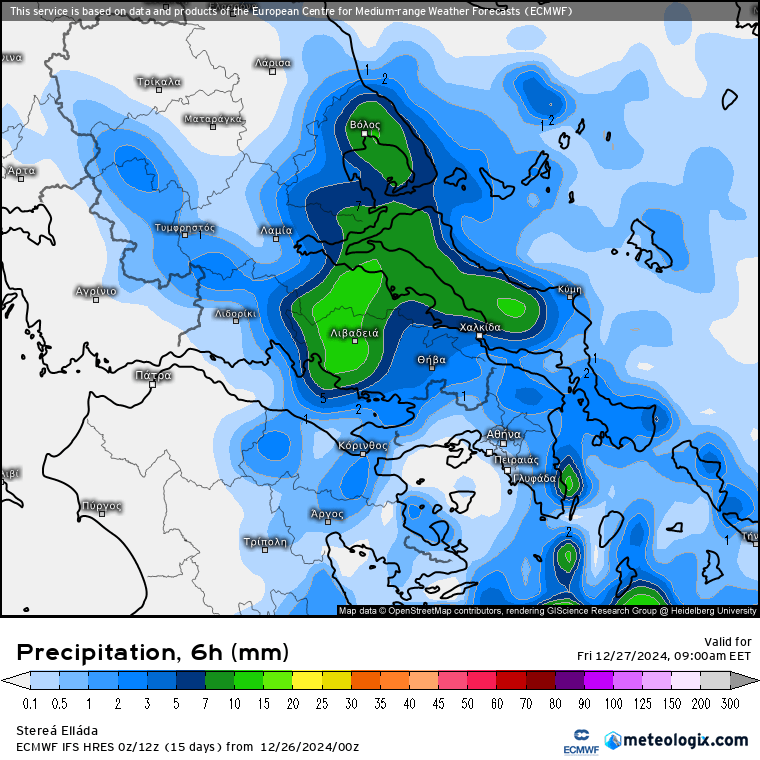 Αντίθετα οι βροχές θα είναι σημαντικές ειδικά στη Βοιωτία, επηρεάζοντας Λοκρίδα και Ανατολική Φθιώτιδα, όπως και την Κεντρική και Βόρεια Εύβοια, καθώς και το Πήλιο όπου βλέπουμε μεγάλα ποσοστά βροχόπτωσης.