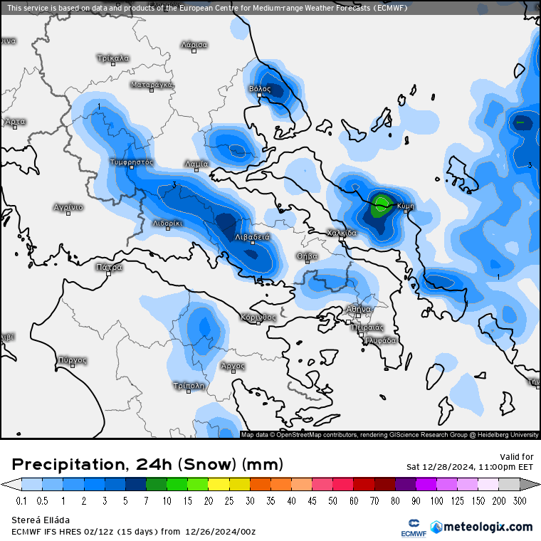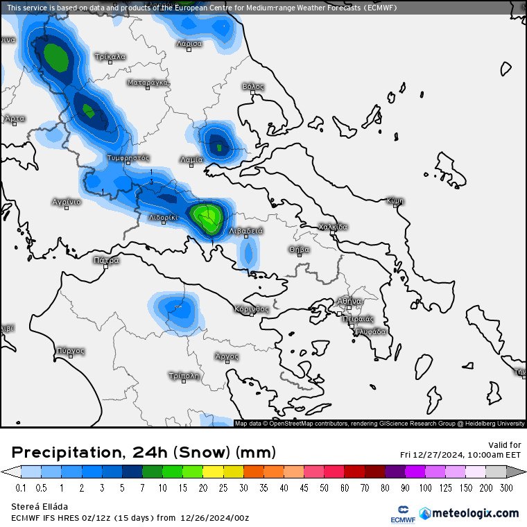 Παρακάτω μπορούμε να δούμε την 24ωρη πρόβλεψη του ECMWF σε βροχή και χιόνι για την περιοχή μας, μέχρι και το πρωί της Παρασκευής. Τα χιόνια επιμένουν μόνο κατά μήκος της κορυφογραμμής από τα Άγραφα και το Βελούχι μέχρι χαμηλά στον Παρνασσό και λίγο στον Ελικώνα. Και φυσικά στην Όθρυ στην ανατολική της γραμμή.