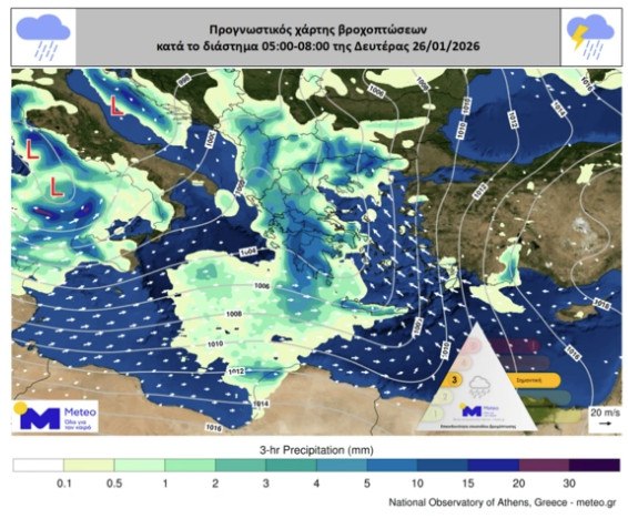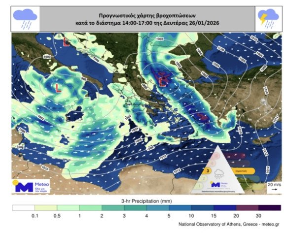 Αναλυτικά και σύμφωνα με την ΕΜΥ, αναμένονται ισχυρές βροχές και καταιγίδες, κατά τόπους και χαλαζοπτώσεις, προβλέπονται σήμερα Δευτέρα (26/01) σε πολλές περιοχές της ανατολικής χώρας και αύριο Τρίτη (27/01) μέχρι το απόγευμα στη νότια - νοτιοανατολική νησιωτική Ελλάδα.