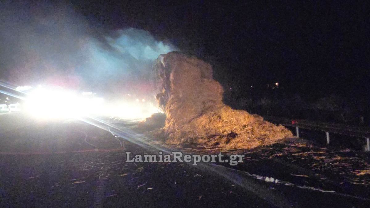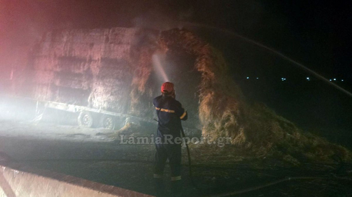 Οδηγός φορτηγού με επικαθήμενο όχημα φορτωμένο με άχυρα, το είδε ξαφνικά να λαμπαδιάζει στο 33ο χλμ, 500 μέτρα πριν την έξοδο Ξυνιάδας.