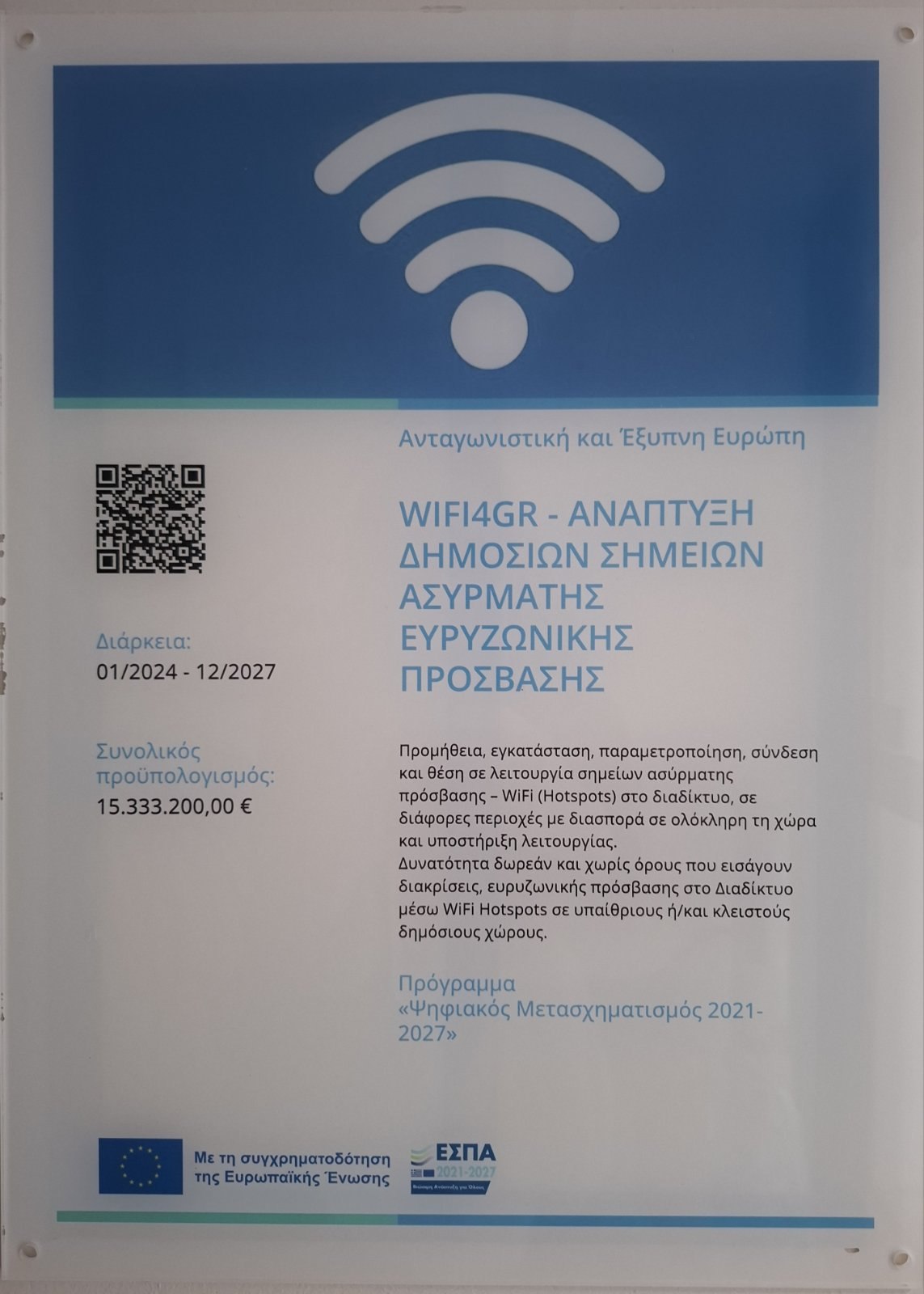 Το πρόγραμμα WiFi4GR αφορά στην προμήθεια, εγκατάσταση, παραμετροποίηση και λειτουργία χιλιάδων σημείων ασύρματης πρόσβασης στο διαδίκτυο (hotspots) σε δημόσιους χώρους σε όλη τη χώρα.