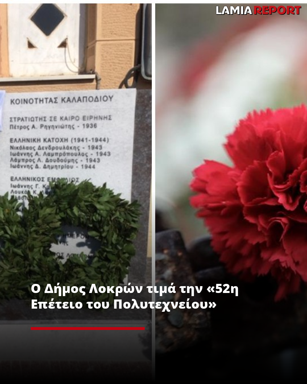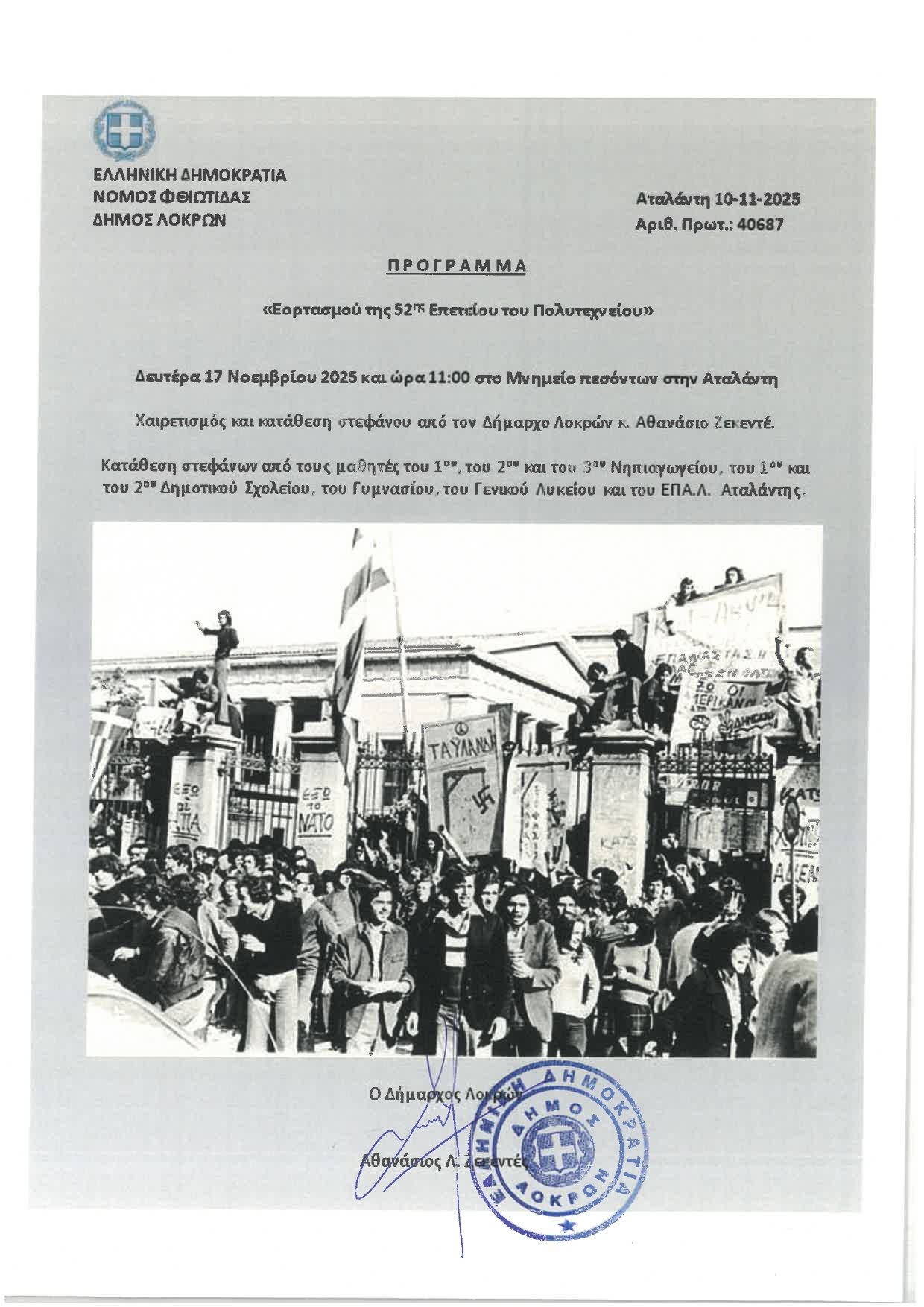 Ο Δήμος Λοκρών διοργανώνει ανήμερα της Επετείου του Πολυτεχνείου 17 Νοέμβρη, στις 11:00 το πρωί τιμητική εκδήλωση στο Μνημείο των Πεσόντων στην Αταλάντη.