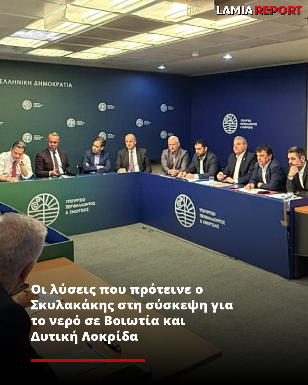Ευρεία σύσκεψη για ζητήματα ύδρευσης και άρδευσης της κεντροδυτικής Βοιωτίας και της δυτικής Λοκρίδας Φθιώτιδας πραγματοποιήθηκε σήμερα, Δευτέρα 24 Φεβρουαρίου 2025, υπό τον Υπουργό Περιβάλλοντος & Ενέργειας Θεόδωρο Σκυλακάκη. Η συνάντηση πραγματοποιήθηκε στο Υπουργείο Περιβάλλοντος κατόπιν αιτήματος της Περιφέρειας Στερεάς Ελλάδας.