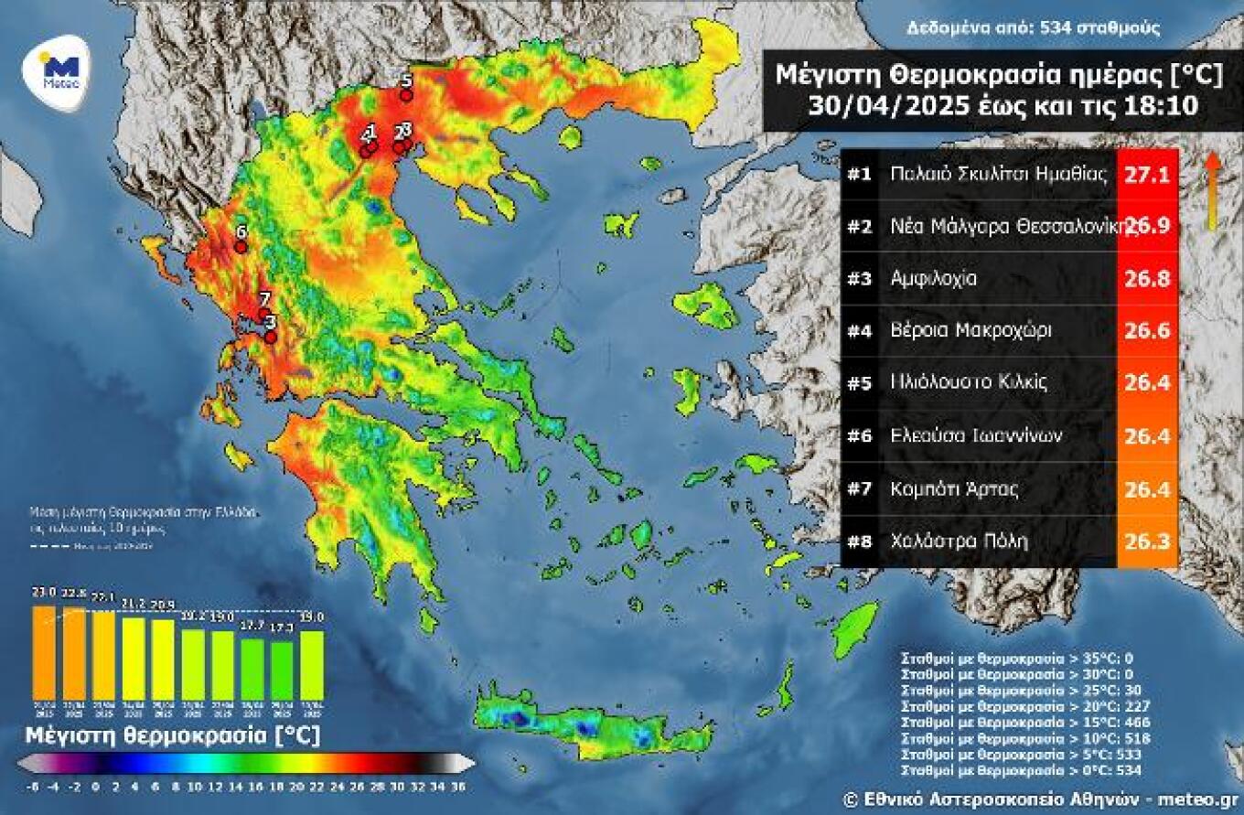 Η υψηλότερη μέγιστη θερμοκρασία καταγράφηκε στο Παλαιό Σκυλίτσι Ημαθίας όπου καταγράφηκαν 27.1 βαθμοί Κελσίου. Στον παρακάτω χάρτη αποτυπώνονται οι μέγιστες τιμές θερμοκρασίας την Τετάρτη 30/4, ενώ στον πίνακα παρουσιάζονται οι 8 υψηλότερες μέγιστες τιμές από 535 μετεωρολογικούς σταθμούς του δικτύου αυτόματων μετεωρολογικών σταθμών του Εθνικού Αστεροσκοπείου Αθηνών / meteo.gr. Στο κάτω μέρος του γραφήματος παρουσιάζεται και η μέση τιμή της μέγιστης θερμοκρασίας τις τελευταίες 10 ημέρες.
