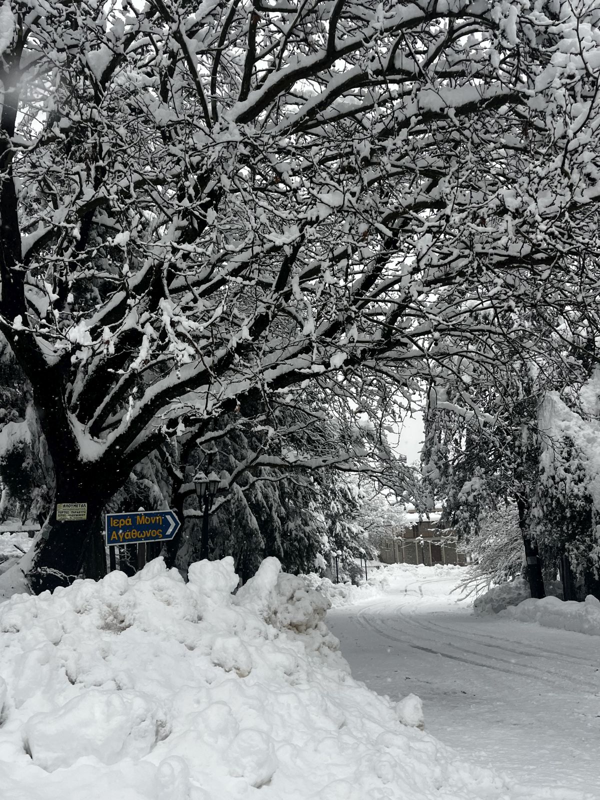 Οι πολύ όμορφες φωτογραφίες που ακολουθούν είναι από την περιοχή της Μονής Αγάθωνος, που ντύθηκε στα λευκά.