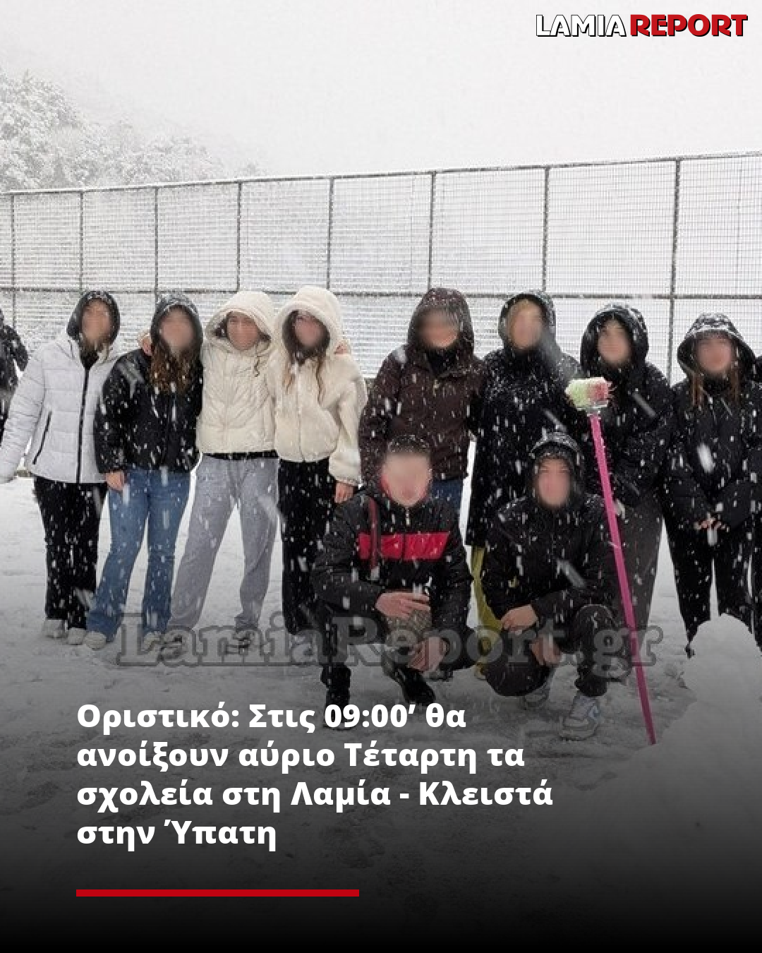 Στις 09:00’ το πρωί θα ανοίξουν την Τετάρτη 21 Ιανουαρίου 2026 τα σχολεία της Πρωτοβάθμιας και Δευτεροβάθμιας Εκπαίδευσης στο Δήμο Λαμιέων, σύμφωνα με απόφαση του Δημάρχου Πανουργιά Παπαϊωάννου μετά τη συνεδρίαση του Τοπικού Συντονιστικού Οργάνου Πολιτικής Προστασίας και την αξιολόγηση των επίσημων δεδομένων του καιρού.