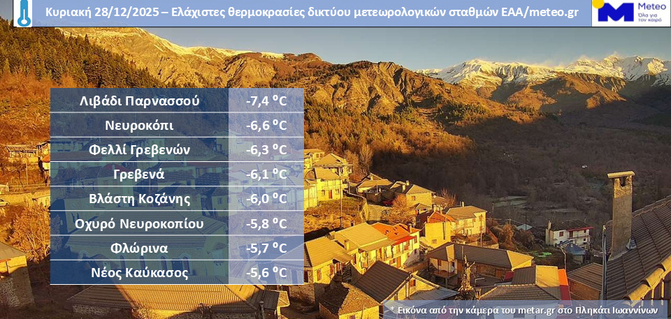 Οι οκτώ χαμηλότερες ελάχιστες θερμοκρασίες της Κυριακής 28/12/2025, όπως καταγράφτηκαν από το δίκτυο αυτόματων μετεωρολογικών σταθμών του Εθνικού Αστεροσκοπείου Αθηνών / meteo.gr, φαίνονται στον παρακάτω πίνακα: