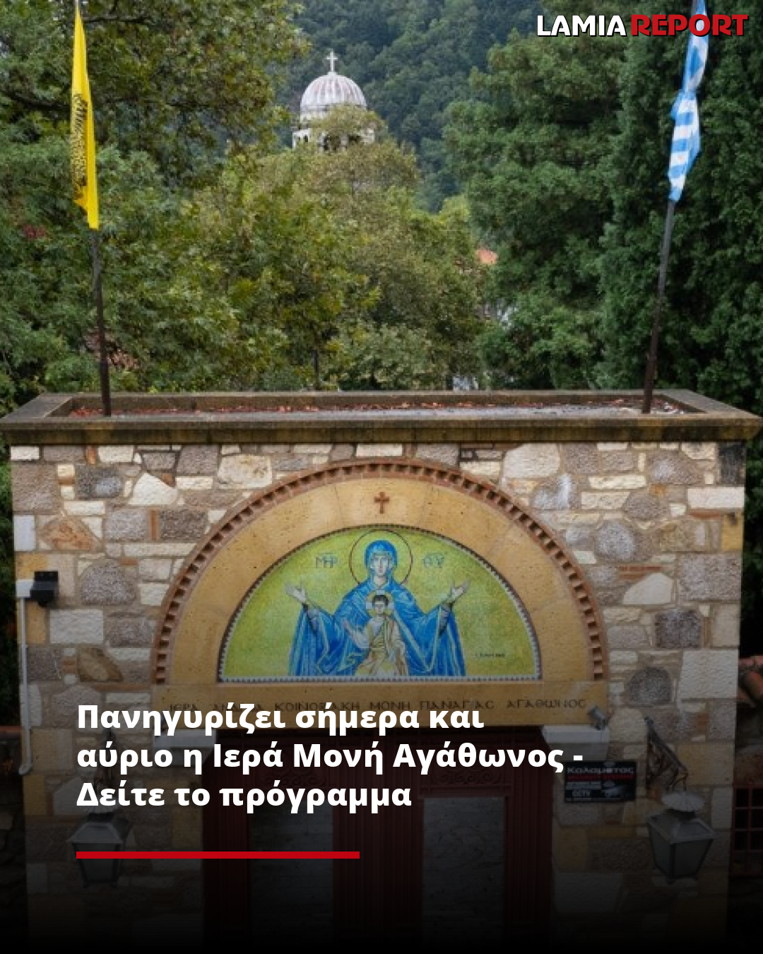 20:00΄μ.μ.: Ἑόρτιος Πανηγυρικός Ἀρχιερατικός Ἐσπερινός στό Καθολικό τῆς Ἱερᾶς Μονῆς Κοιμήσεως Θεοτόκου Ὁσίου Ἀγάθωνος, Χοροστατοῦντος τοῦ Σεπτοῦ Ποιμενάρχου μας, Σεβασμιωτάτου Μητροπολίτου Φθιώτιδος κ. κ. Συμεών.