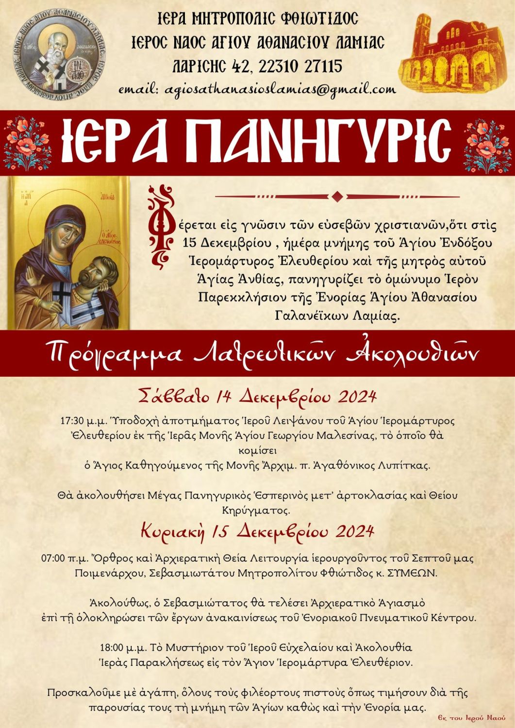 Πανηγυρίζει το εκκλησάκι του Αγίου Ελευθερίου στον Ι.Ν. Αγίου Αθανασίου Λαμίας - Αναλυτικό Πρόγραμμα