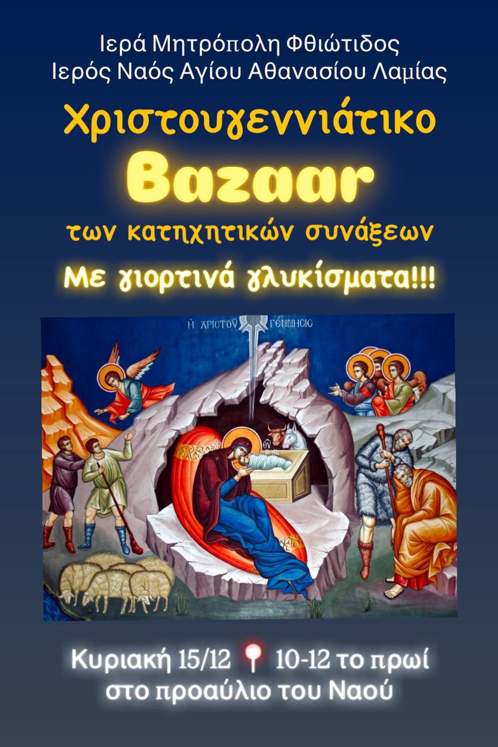 Στὸ προαύλιο τοῦ Ἱεροῦ Ναοῦ, ἀπὸ τὶς 10:00 π.μ. ἕως 12:00 μ.μ. θὰ πραγματοποιηθεῖ τὸ Χριστουγεννιάτικο Bazaar μὲ ἑορταστικὰ γλυκίσματα ἀπὸ τὰ παιδιὰ τῶν Κατηχητικῶν τῆς Ἐνορίας μας!