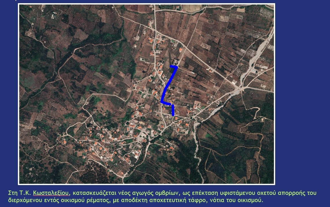 - Στη Τ.Κ. Κωσταλεξίου, κατασκευάζεται νέος αγωγός ομβρίων, ως επέκταση υφιστάμενου οχετού απορροής του διερχόμενου εντός οικισμού ρέματος, με αποδέκτη αποχετευτική τάφρο, νότια του οικισμού.