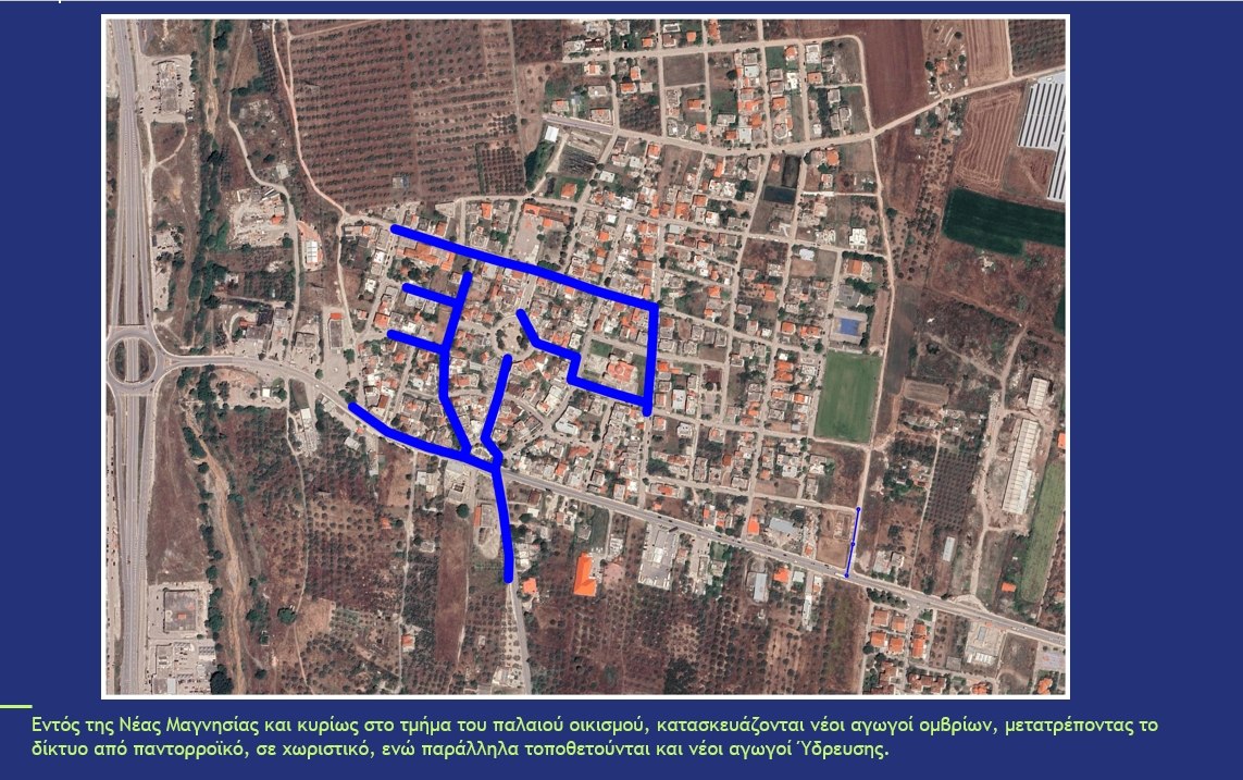 - Εντός της Νέας Μαγνησίας και κυρίως στο τμήμα του παλαιού οικισμού, κατασκευάζονται νέοι αγωγοί ομβρίων, μετατρέποντας το δίκτυο από παντορροϊκό, σε χωριστικό, ενώ παράλληλα τοποθετούνται και νέοι αγωγοί Ύδρευσης.