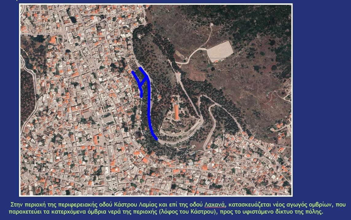 - Στην περιοχή της περιφερειακής οδού Κάστρου Λαμίας και επί της οδού Λαχανά, κατασκευάζεται νέος αγωγός ομβρίων, που παροχετεύει τα όμβρια νερά της περιοχής (λόφος του Κάστρου), προς το υφιστάμενο δίκτυο της πόλης.