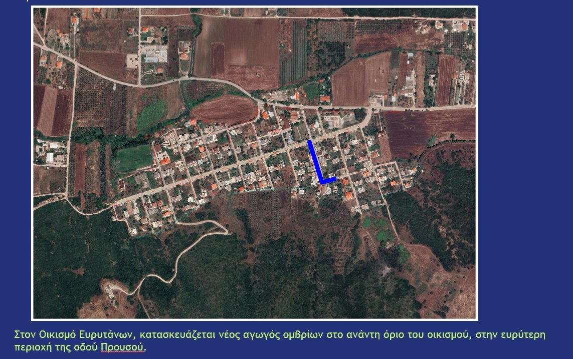 - Στον οικισμό Ευρυτάνων, κατασκευάζεται νέος αγωγός ομβρίων στο ανάντη όριο του οικισμού, στην ευρύτερη περιοχή της οδού Προυσού.
