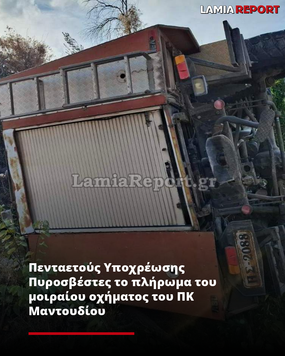 Σήμερα, Παρασκευή 01 Νοεμβρίου 2024, μεσημεριανές ώρες, το Π.Σ. 2088 όχημα του Π.Κ. Μαντουδίου στελεχωμένο με δύο (2) Πυροσβεστικούς υπαλλήλους, κατά τη διάρκεια περιπολίας, ανετράπη πλησίον της περιοχής Κοτσικιά του δήμου Μαντουδίου – Λίμνης - Αγίας Άννας, στην Εύβοια.