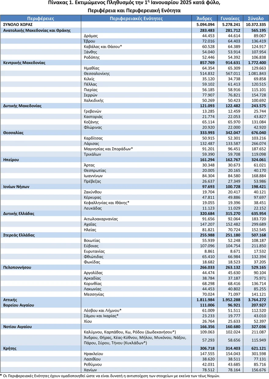 Σύμφωνα με την ΕΛΣΤΑΤ (18 Δεκεμβρίου 2025), ο μόνιμος πληθυσμός της Ελλάδας την 1η Ιανουαρίου 2025 ανερχόταν σε 10.372.335 άτομα, καταγράφοντας οριακή μείωση 0,03% σε σχέση με το 2024, όταν ο πληθυσμός είχε αναθεωρηθεί σε 10.375.764.