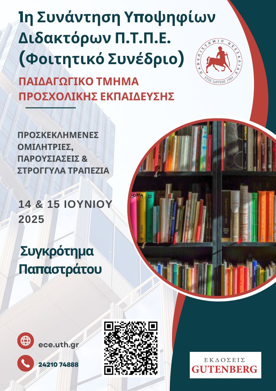 Το Παιδαγωγικό Τμήμα Προσχολικής Εκπαίδευσης (Π.Τ.Π.Ε.) της Σχολής Ανθρωπιστικών & Κοινωνικών Επιστημών του Πανεπιστημίου Θεσσαλίας διοργάνωσε με επιτυχία την 1η Συνάντηση Υποψηφίων Διδακτόρων Π.Τ.Π.Ε. (Φοιτητικό Συνέδριο). Η επιστημονική διημερίδα διεξήχθη το Σάββατο 14 και την Κυριακή 15 Ιουνίου 2025, στον Βόλο, στην Αίθουσα Α του Κτηρίου Δελμούζου, στο παραλιακό Συγκρότημα Παπαστράτου (δείτε την αφίσα και το πρόγραμμα).
