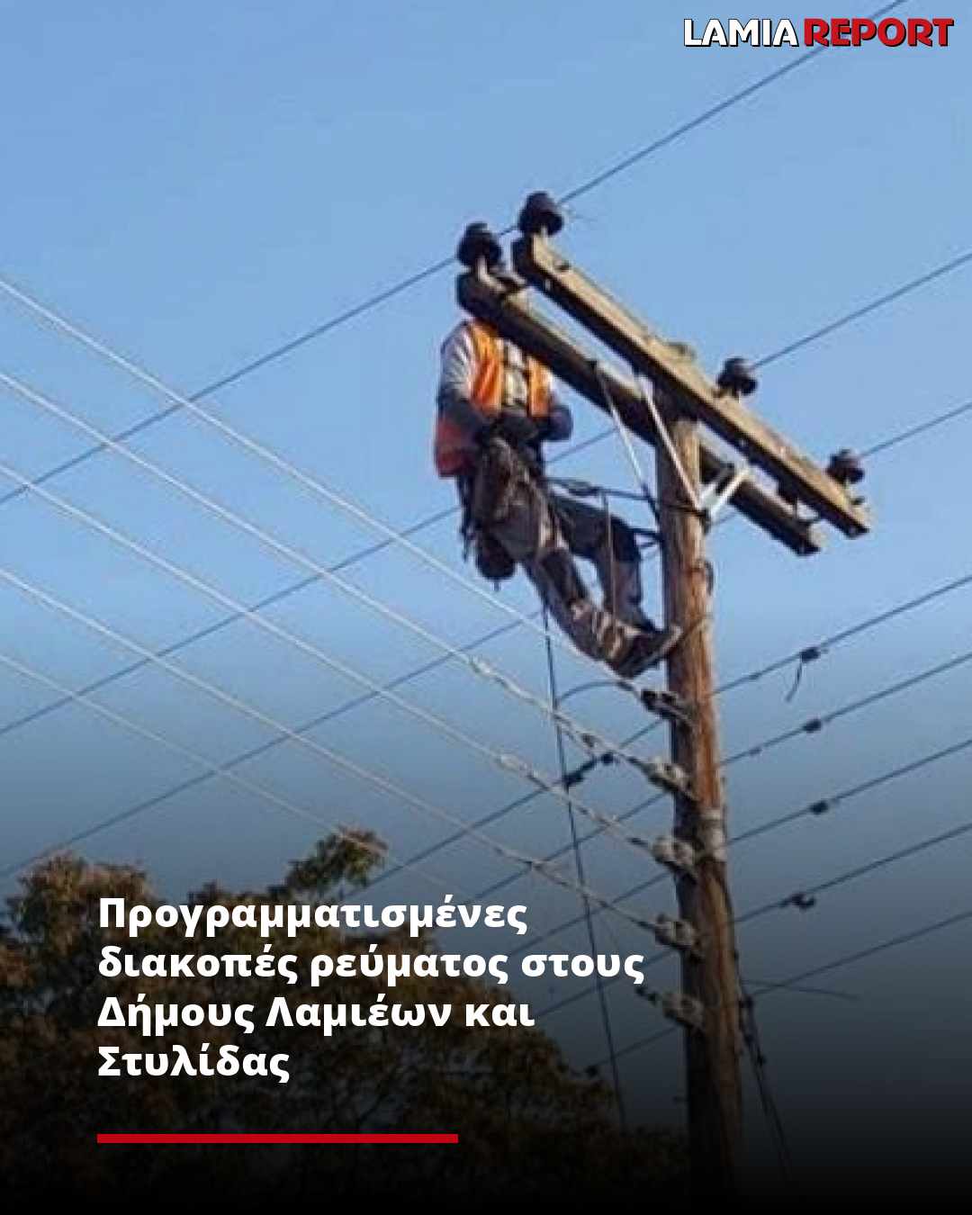 Το Γραφείο του ΔΕΔΔΗΕ περιοχή Λαμίας ενημέρωσε για προγραμματισμένες διακοπές ρεύματος, λόγω εργασιών στο δίκτυο Μέσης και Χαμηλής Τάσης, σε περιοχές των Δήμων Λαμιέων και Στυλίδας. Συγκεκριμένα: