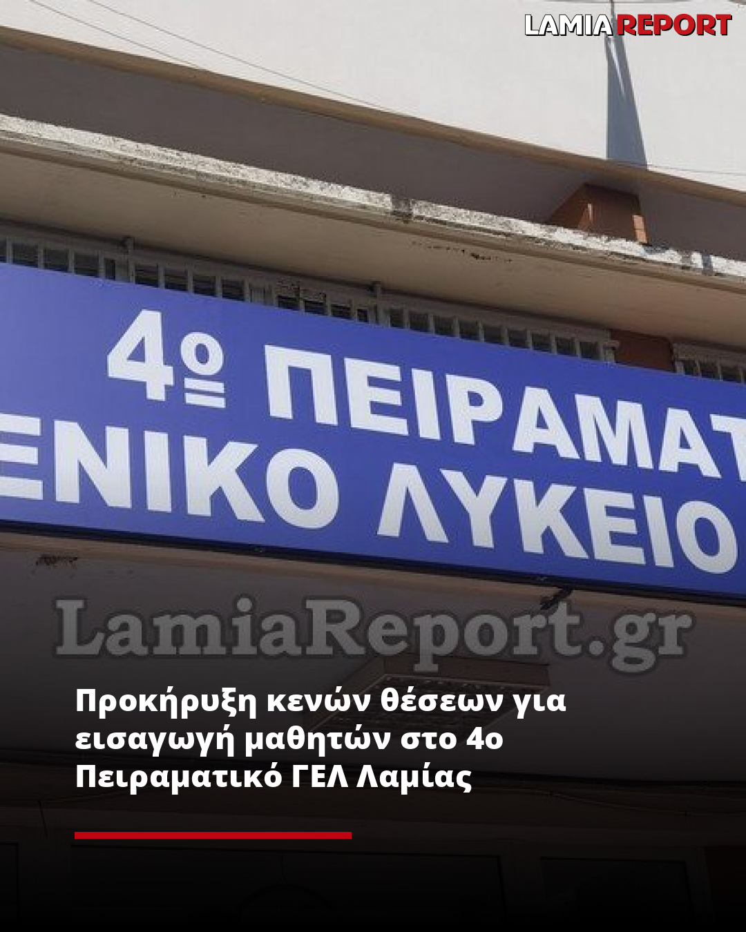 Η Διεύθυνση του 4ου Πειραματικού Γενικού Λυκείου Λαμίας σύμφωνα με την 12/15-09-2025 Πράξη του Κοινού ΕΠ.Ε.Σ. Λαμίας προκηρύσσει τις παρακάτω κενές θέσεις για εισαγωγή μαθητών/τριών κατά το σχολικό έτος 2025-26:
