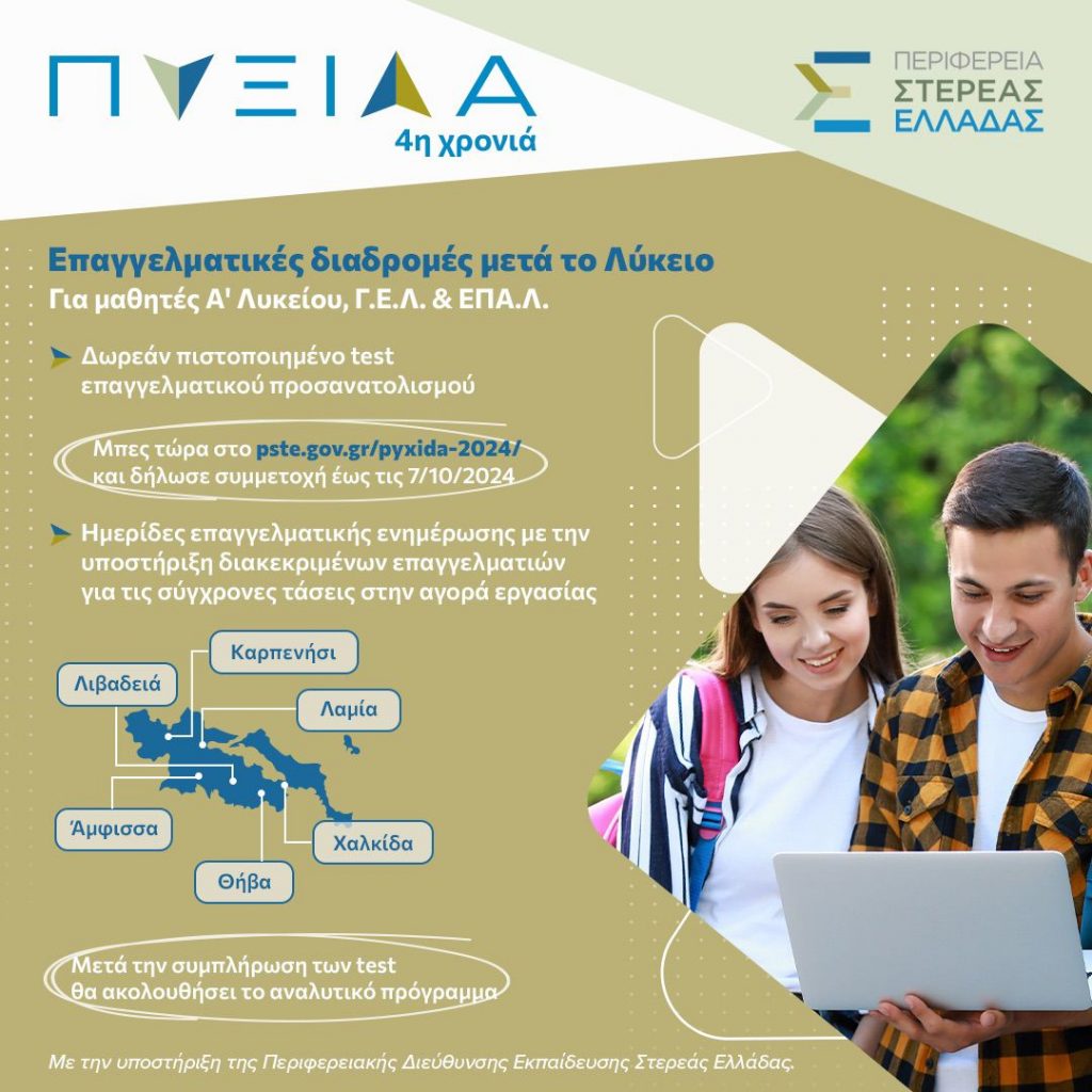 Η Περιφέρεια Στερεάς Ελλάδας διοργανώνει για 4η συνεχή χρονιά το καινοτόμο πρόγραμμα «ΠΥΞΙΔΑ», προκειμένου να βοηθήσει τις μαθήτριες και τους μαθητές να ανακαλύψουν τις δεξιότητές τους και τα επαγγελματικά τους ενδιαφέροντα.
