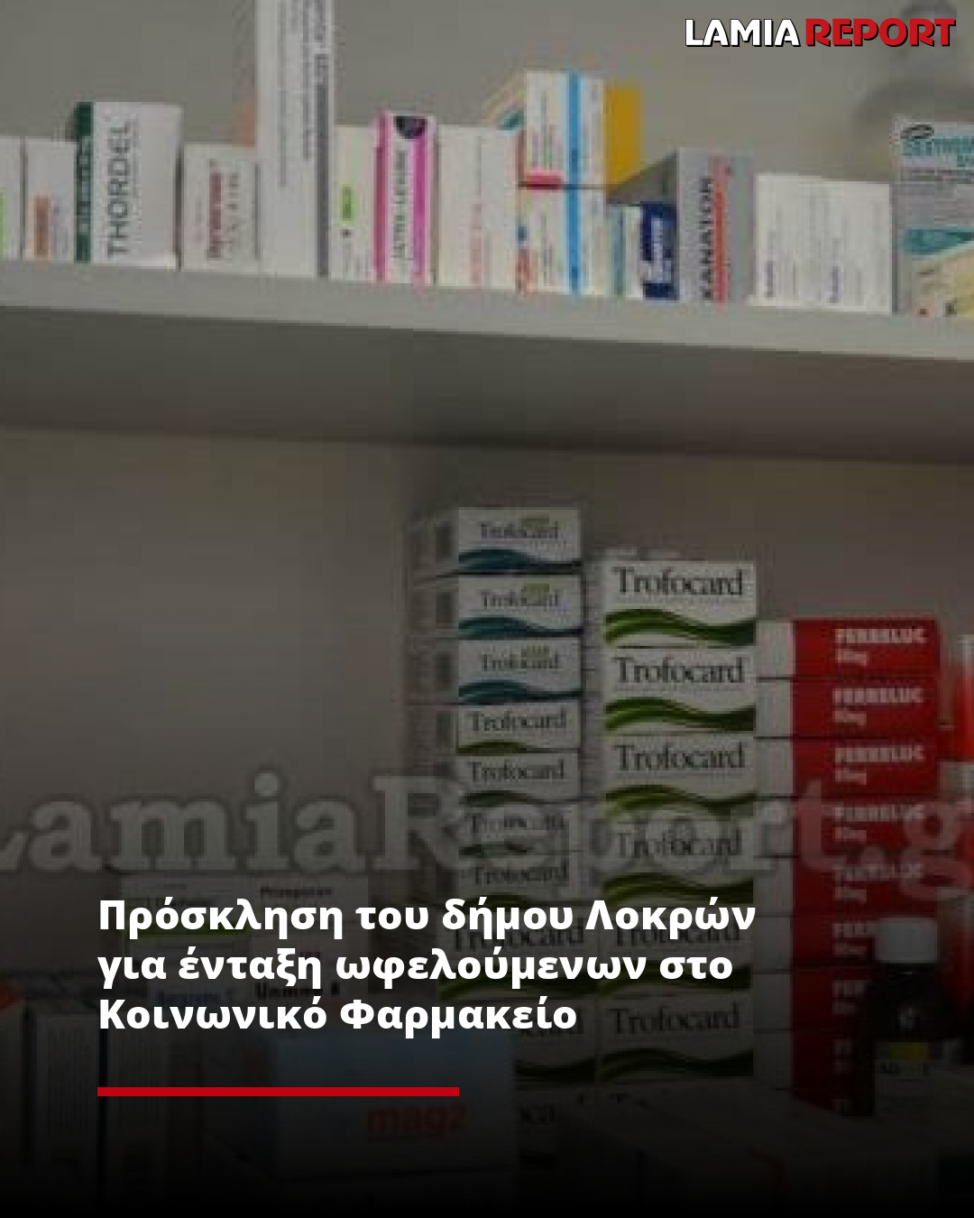 Ο Δήμος Λοκρών, στο πλαίσιο της κοινωνικής του πολιτικής και με στόχο την προάσπιση της δημόσιας υγείας και την στήριξη των ευπαθών ομάδων πληθυσμού, καλεί τους ενδιαφερόμενους κατοίκους που πληρούν τις προϋποθέσεις, να υποβάλουν αίτηση συμμετοχής στη δομή του Κοινωνικού Φαρμακείου.
