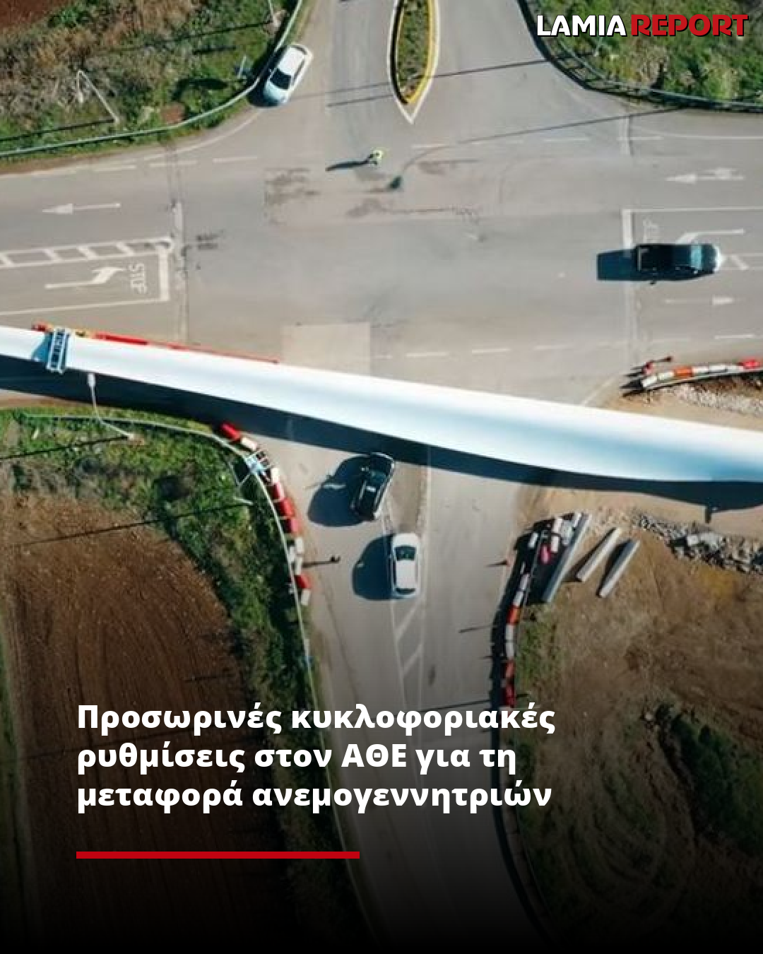 Κυκλοφοριακές ρυθμίσεις για λόγους συνοδείας με προσωρινή, σταδιακή και ολιγόλεπτη διακοπή της κυκλοφορίας στη δεξιά λωρίδα, προβλέπονται από τη Διεύθυνση Αστυνομίας Φθιώτιδας προκειμένου να πραγματοποιηθεί μεταφορά τμημάτων (φτερών) ανεμογεννήτριας, από τα Αιολικά Πάρκα Καραμούτζι και Κορφούλα (είσοδος από τον Α/Κ Θήβας) προς το Λιμάνι της Στυλίδας (έξοδος στον Α/Κ Αγίας Μαρίνας στη Χ/Θ 223+300).