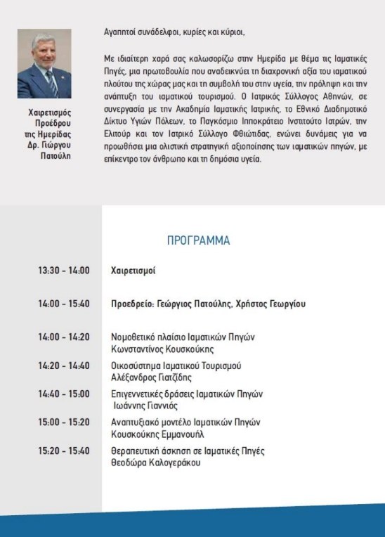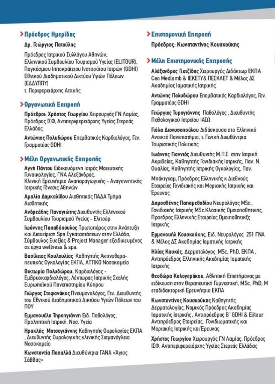 Γιώργος Πατούλης Πρόεδρος Ιατρικού Συλλόγου Αθηνών, Ελληνικού Συμβουλίου Τουρισμού Υγείας (ELITOUR), Παγκόσμιου Ιπποκράτειου Ινστιτούτου Ιατρών (GDHI) Εθνικού Διαδημοτικού Δικτύου Υγιών Πόλεων (ΕΔΔΥΠΠΥ) τ. Περιφερειάρχης Αττικής