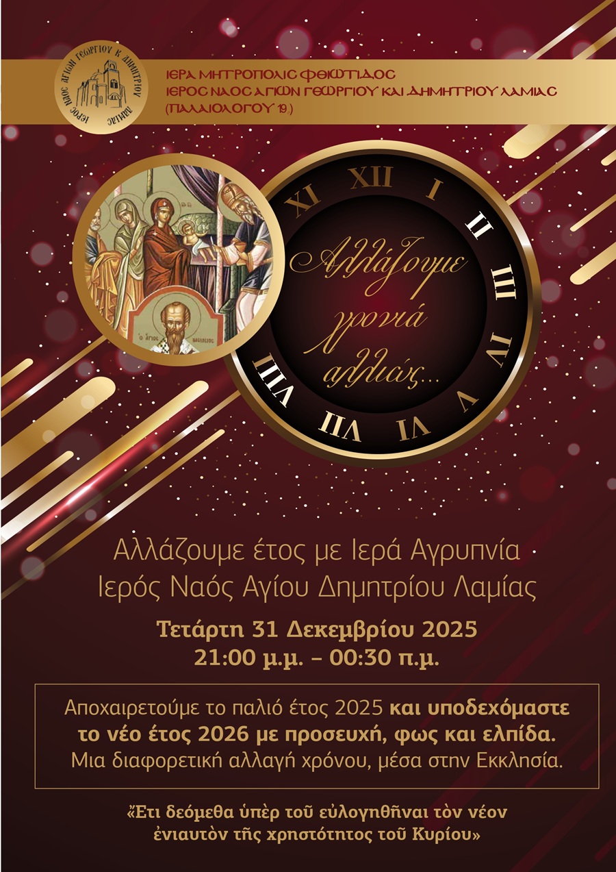 Μια διαφορετική πρόσκληση για «ρεβεγιόν» Πρωτοχρονιάς από τον Ιερό Ναό Αγίου Δημητρίου Λαμίας. Μια Ιερή Αγρυπνία, με προσευχή για την έλευση του 2026.