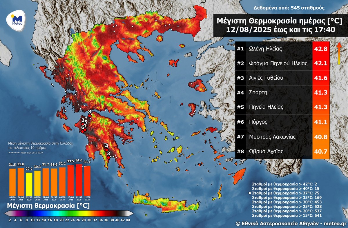 Σε Πελοπόννησο, Δυτική Στερεά και Ήπειρο καταγράφηκαν οι υψηλότερες θερμοκρασίες της Τρίτης 12/08, σύμφωνα με το δίκτυο αυτόματων μετεωρολογικών σταθμών του Εθνικού Αστεροσκοπείου Αθηνών / meteo.gr.