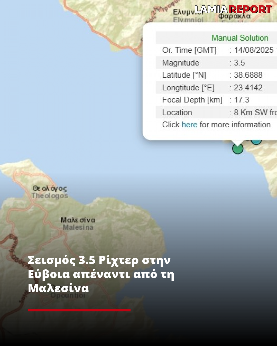 Σεισμός μεγέθους 3.5 βαθμών της κλίμακας ρίχτερ σημειώθηκε λίγα λεπτά πριν τις 18:00’ κοντά στη θαλάσσια περιοχή του Προκοπίου Ευβοίας ακριβώς απέναντι από την ακτή του Θεολόγου και της Μαλεσίνας Λοκρίδας.