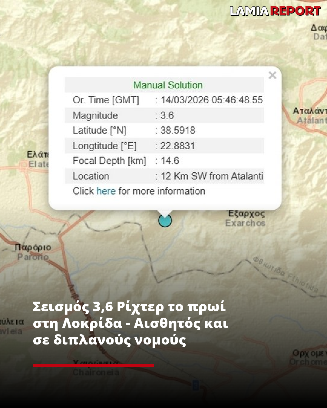 Σεισμική δόνηση μεγέθους 3,6 βαθμών της κλίμακας Ρίχτερ σημειώθηκε στις 07:46’ το πρωί στη γνωστή περιοχή μεταξύ Εξάρχου και Καλαποδίου στη Λοκρίδα, η οποία έγινε αισθητή και στην ευρύτερη περιοχή της Φθιώτιδας, της βόρειας Βοιωτίας και της Φωκίδας.