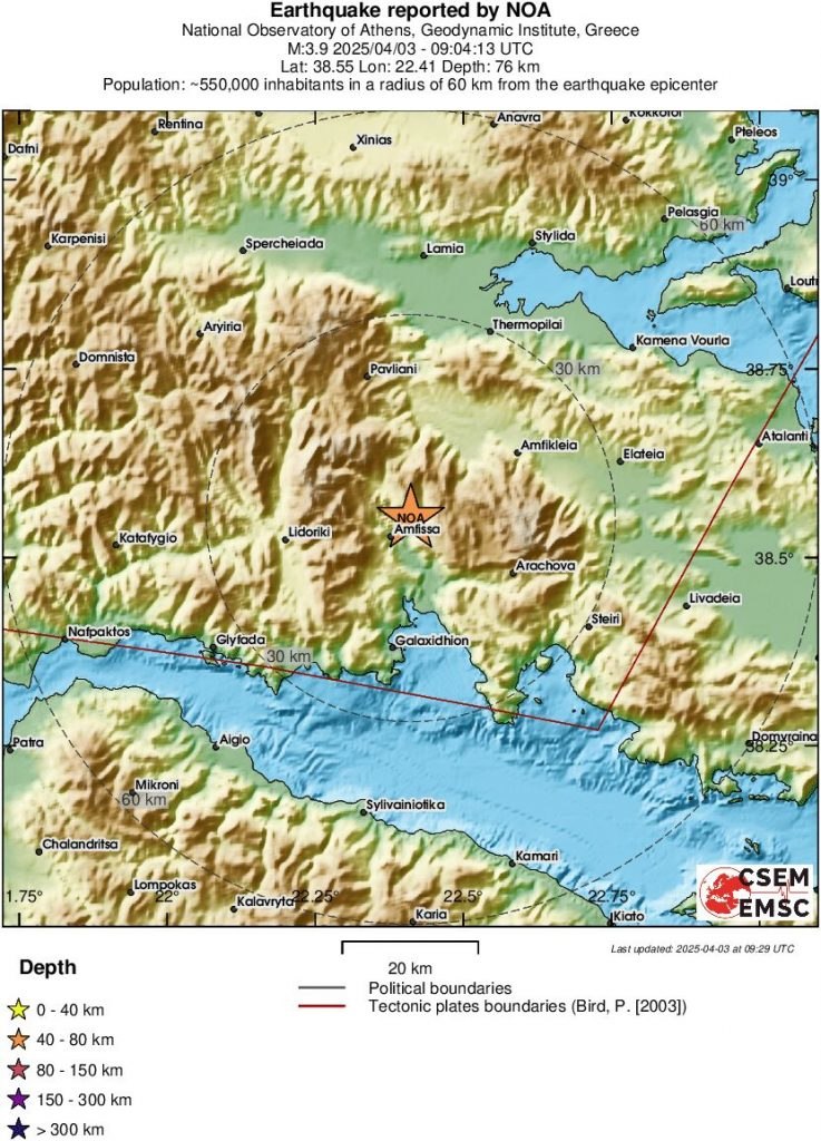 Αρκετά ισχυρή σεισμική δόνηση μεγέθους 3,9 της κλίμακας Ρίχτερ, σύμφωνα με την αναθεωρημένη λύση του Γεωδυναμικού Ινστιτούτου του Εθνικού Αστεροσκοπείου Αθηνών, σημειώθηκε στις 12:05 περίπου το μεσημέρι (ώρα Ελλάδας) της Πέμπτης (3/4/25), με επίκεντρο 4 χιλιόμετρα βορειανατολικά της Άμφισσας.