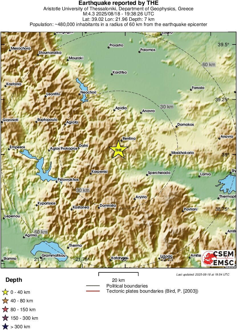 Σεισμός 4,3 Ρίχτερ στα όρια Καρδίτσας - Δυτικής Φθιώτιδας, αισθητός και στη Λαμία