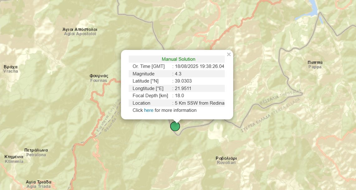 Σεισμός μεγέθους 4,3 της κλίμακας Ρίχτερ σημειώθηκε στις 22:38' το βράδυ της Δευτέρας (18/8) στα όρια των νομών Καρδίτσας και Φθιώτιδας, 5 χιλιόμετρα νότια - νοτιοδυτικά της Ρεντίνας.