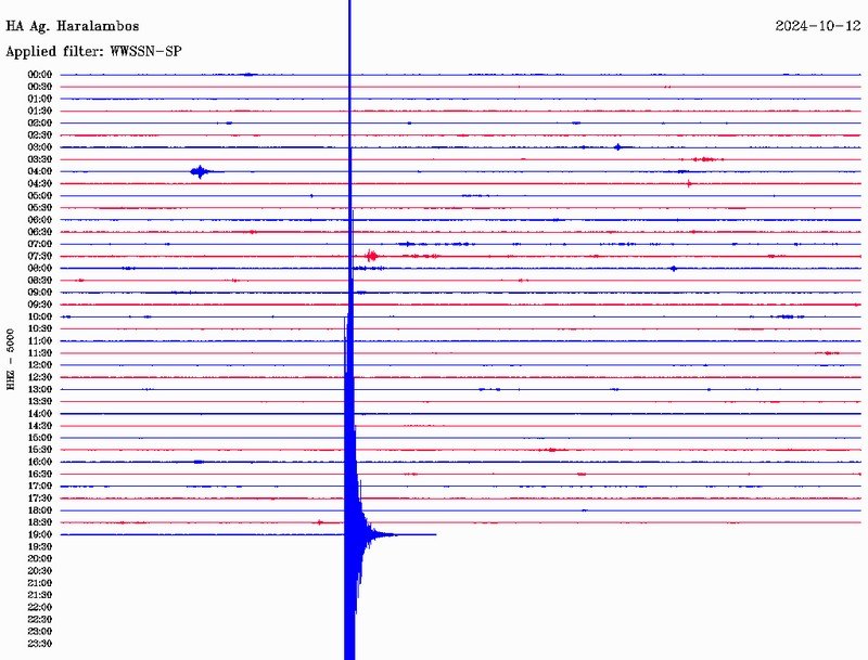 Δείτε πως κατέγραψε το σεισμό ο σεισμογράφος στον Άγιο Χαράλαμπο Μώλου που βρίσκεται 57 χιλιόμετρα από το επίκεντρο που υπολόγισε το Εργαστήριο Σεισμολογίας του ΕΚΠΑ.