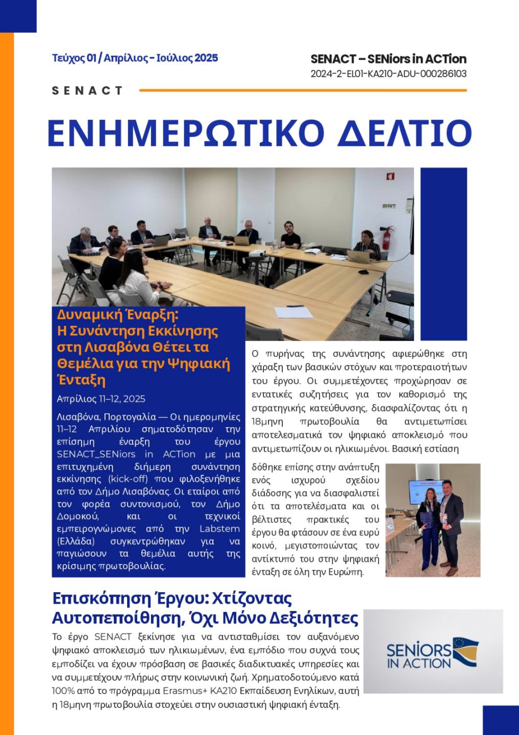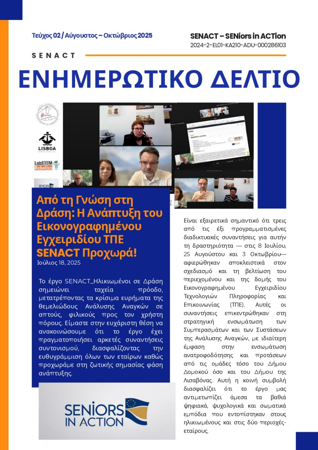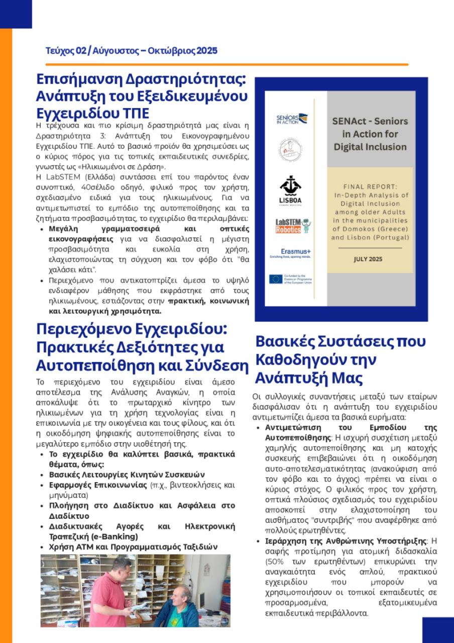 «Το έργο SENACT_Ηλικιωμένοι σε Δράση σημειώνει ταχεία πρόοδο, μετατρέποντας τα κρίσιμα ευρήματα της θεμελιώδους Ανάλυσης Αναγκών σε απτούς, φιλικούς προς τον χρήστη πόρους. Είμαστε στην ευχάριστη θέση να ανακοινώσουμε ότι το έργο έχει πραγματοποιήσει αρκετές συναντήσεις συντονισμού, διασφαλίζοντας την ευθυγράμμιση όλων των εταίρων καθώς προχωράμε στη ζωτικής σημασίας φάση ανάπτυξης.