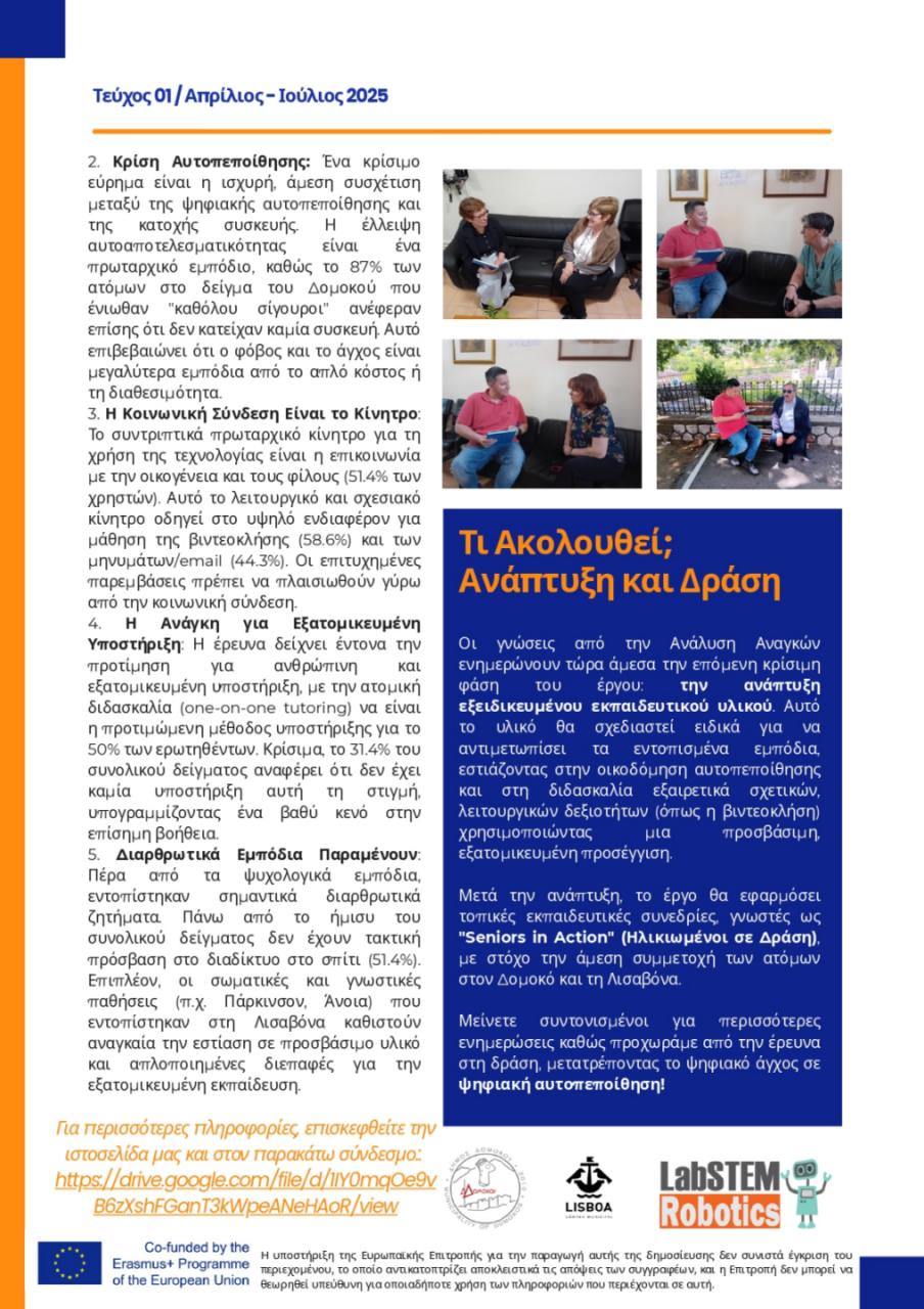 Η LabSTEM (Ελλάδα) συντάσσει επί του παρόντος έναν συνοπτικό, 40σέλιδο οδηγό, φιλικό προς τον χρήστη, σχεδιασμένο ειδικά για τους ηλικιωμένους. Για να αντιμετωπιστεί το εμπόδιο της αυτοπεποίθησης και τα ζητήματα προσβασιμότητας, το εγχειρίδιο θα περιλαμβάνει: