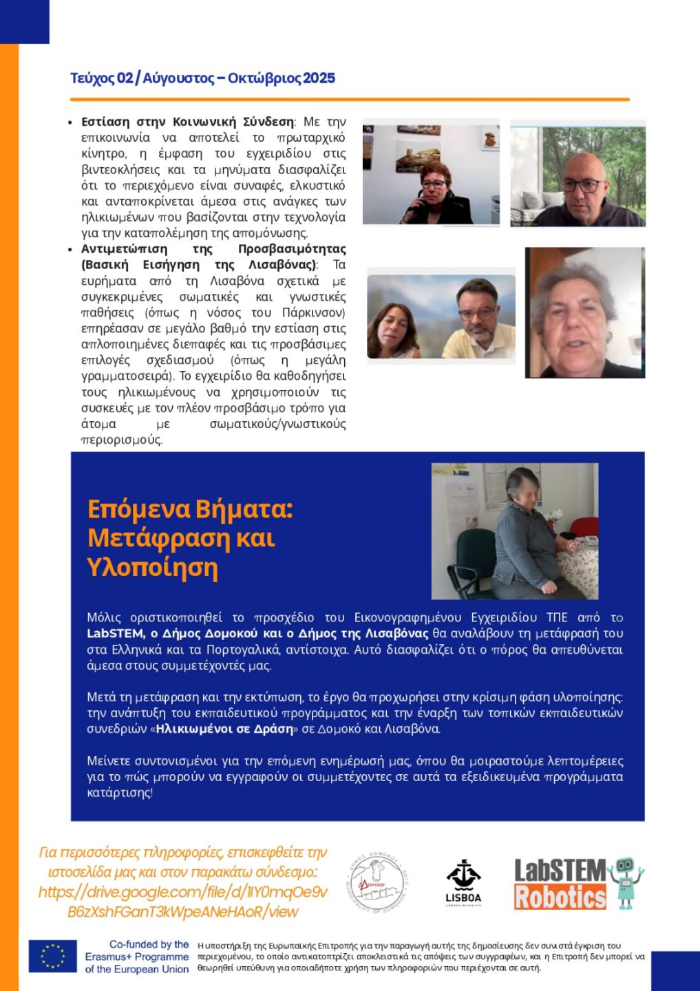 Μετά τη μετάφραση και την εκτύπωση, το έργο θα προχωρήσει στην κρίσιμη φάση υλοποίησης: την ανάπτυξη του εκπαιδευτικού προγράμματος και την έναρξη των τοπικών εκπαιδευτικών συνεδριών «Ηλικιωμένοι σε Δράση» σε Δομοκό και Λισαβόνα.