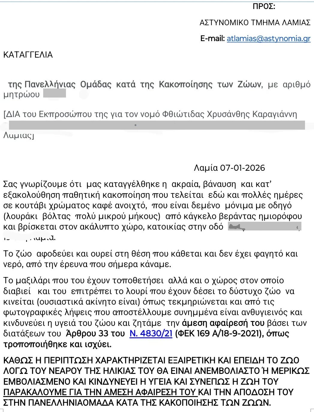 Σοβαρή καταγγελία για βάναυση κακοποίηση ζώου στη Λαμία