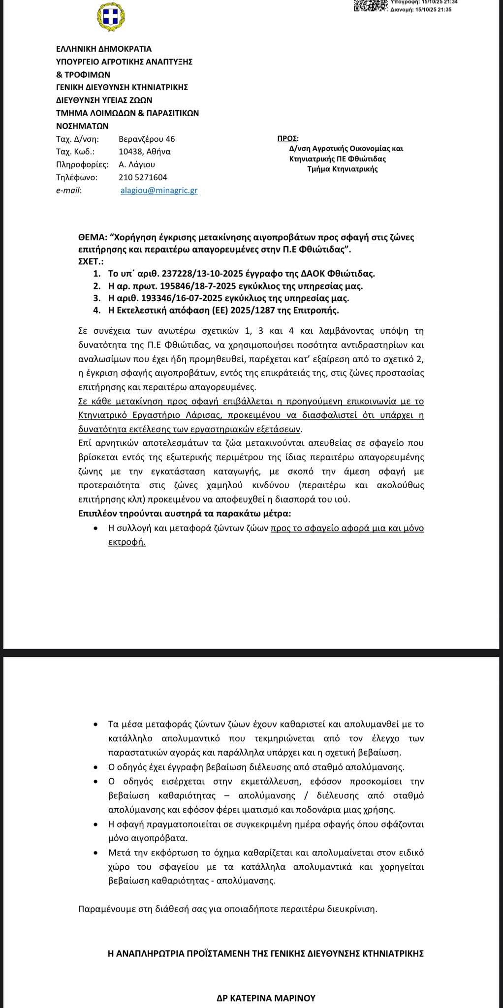 Σύμφωνα με το έγγραφο του ΥΠΑΑΤ, παρέχεται κατ' εξαίρεση η έγκριση σφαγής αιγοπροβάτων, εντός της επικράτειάς της ΠΕ Φθιώτιδας, στις ζώνες προστασίας επιτήρησης και περαιτέρω απαγορευμένες.