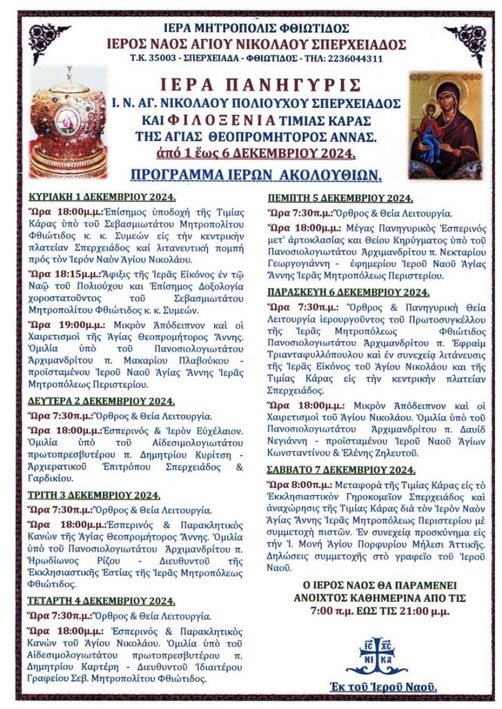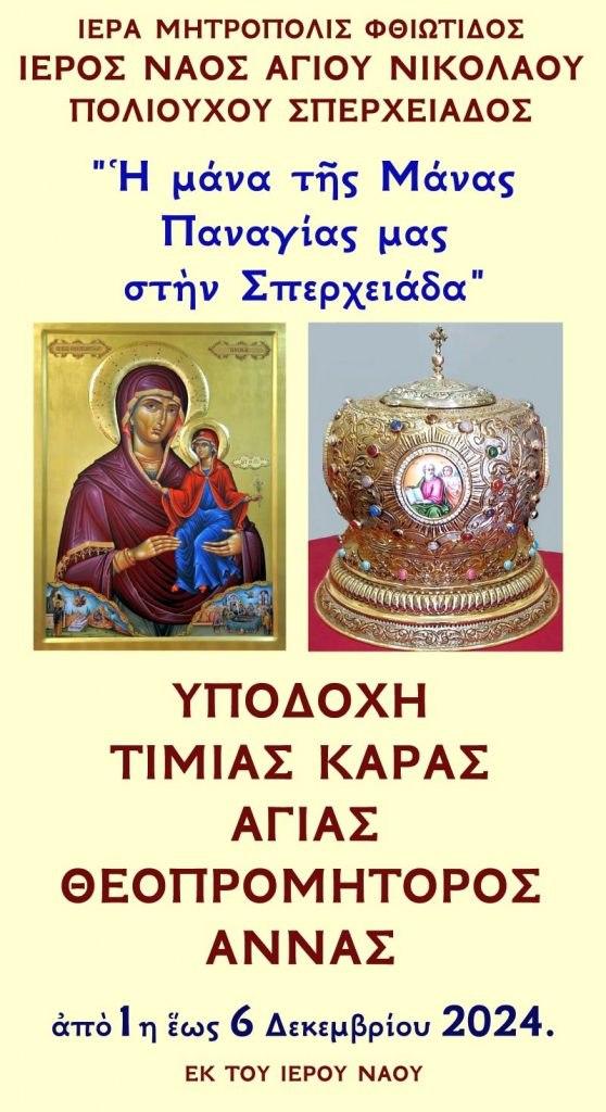 Από 1 Δεκεμβρίου έως 6 Δεκεμβρίου 2024 θα φιλοξενηθεί και η Τίμια Κάρα της Αγίας Θεοπρομήτορος Άννης.