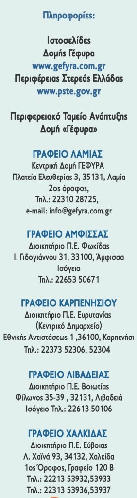 Για πληροφορίες και αιτήσεις (με καταληκτική ημερομηνία 16/2/2025) οι ενδιαφερόμενοι μπορούν να ενημερωθούν από την ιστοσελίδα της Δομής www.gefyra.com.gr και από τα Περιφερειακά Γραφεία ως ακολούθως: