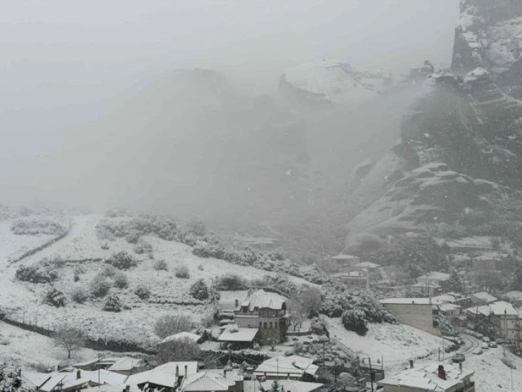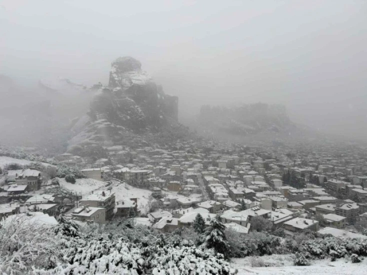 Η πόλη της Καλαμπάκας ξύπνησε το πρωί της Τετάρτης (21.1) στα λευκά. Το χιονισμένο τοπίο στη σκιά των βράχων των Μετεώρων δημιουργεί ένα άκρως εντυπωσιακό και χειμωνιάτικο σκηνικό.