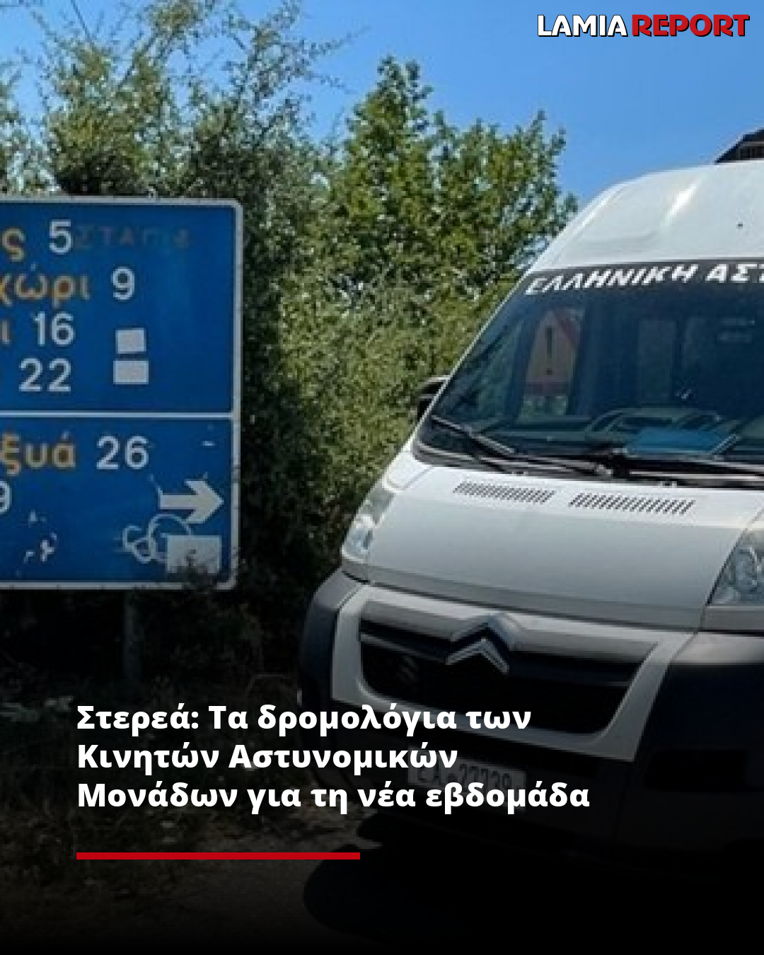 Ανακοινώθηκαν για την νέα εβδομάδα από 24-02 έως και 01-03-2025, τα δρομολόγια των Κινητών Αστυνομικών Μονάδων (Κ.Α.Μ.), της Γενικής Περιφερειακής Αστυνομικής Διεύθυνσης Στερεάς Ελλάδας, ανά Διεύθυνση Αστυνομίας. Αναλυτικά: